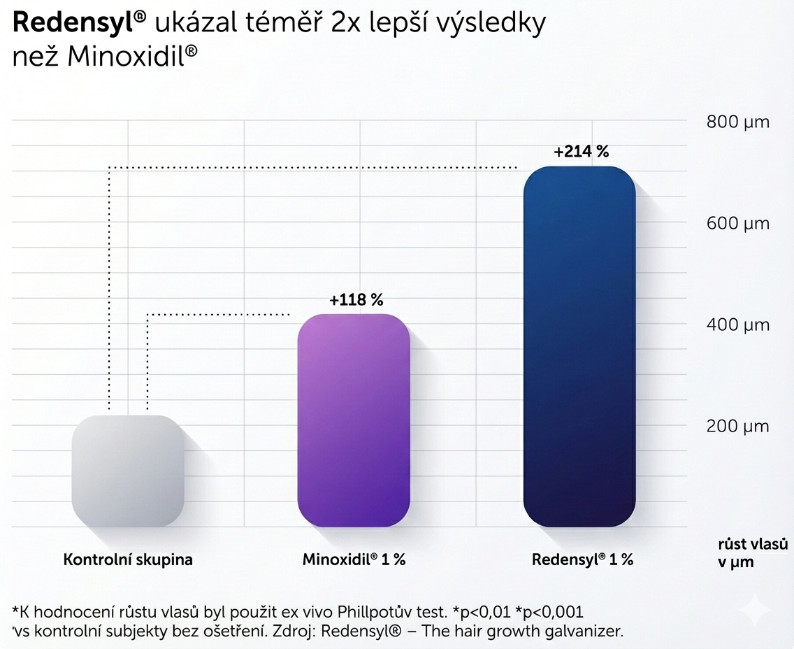 - Redensyl: Téměř dvakrát účinnější než Minoxidil při stimulaci růstu vlasů — prokazatelně zvyšuje aktivitu vlasových folikulů o +214 % už za 10 dní.¹
